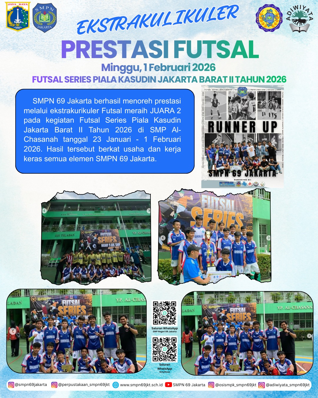 melalui ekstrakurikuler Futsal meraih JUARA 2 pada kegiatan Futsal Series Piala Kasudin Jakarta Barat II Tahun 2026 di SMP Al-Chasanah tanggal 23 Januari – 1 Februari